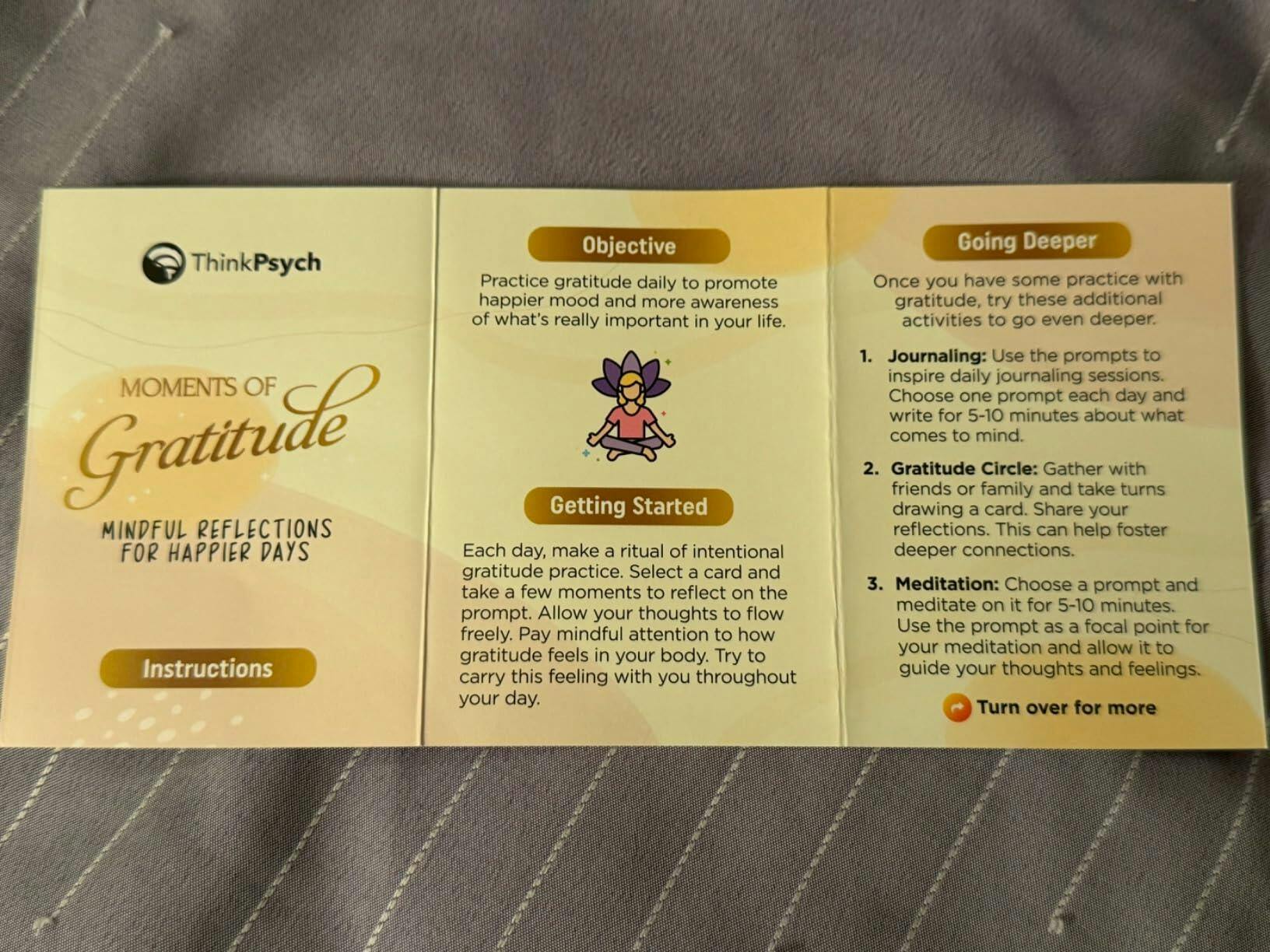 This is my 3rd or 4th set of gratitude/mindfulness cards and it’s not bad, but after a few of these cards, something about how they state/phrase the statements seems very repetitive and I prefer my other decks of cards to this one.